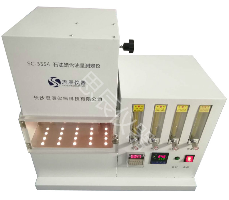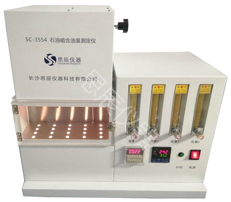 本儀器是中華人民共和國(guó)標(biāo)準(zhǔn) GB/T3554《石油蠟含油量測(cè)定法》所規(guī)定的要求設(shè)計(jì)制造的,本儀器適用于凍凝點(diǎn)在 30℃以上,含油量不大于 15%的石油蠟。對(duì)于某些含油量大于5%,在丁酮中不能完全溶解而分層的石油蠟本儀器不適用。 將試樣溶解于丁酮溶劑中,溶液冷卻至-32℃時(shí)析出蠟,經(jīng)過(guò)濾管取出濾液。并將濾液中的溶劑蒸出,稱重殘留油,通過(guò)計(jì)算得到試樣含油量的質(zhì)量分?jǐn)?shù)。